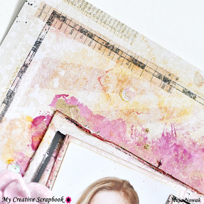 Pod zdjęciem przygotowałam "akwarelowe" tło z mgiełki i złotej farby, następnie ułożyłam kompozycję z kawałków papierów, die-cutów i kwiatów. Dodałam też embossowane na złoto tekturowe słońce, co koresponduje z tytułem. Całości dopełniają delikatne, przezroczyste cekiny.